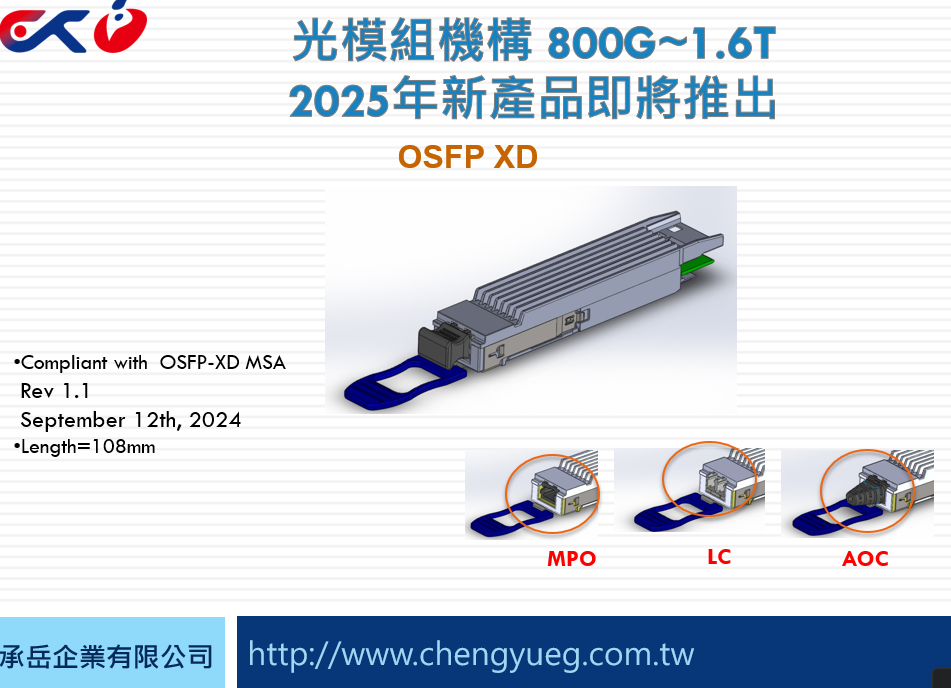 光模組機構新產品推出 OSFP 800G~1.6T